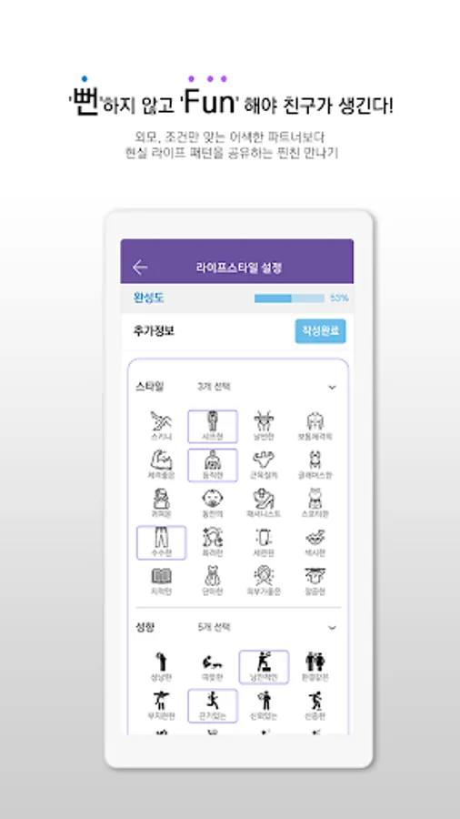 8. Excluding artificial and unreliable conditions such as appearance, body type, height, and income, authentic and diverse lifestyle items such as style, inclination, hobbies, MBTI, drinking, smoking, and religion can be set in the profile.