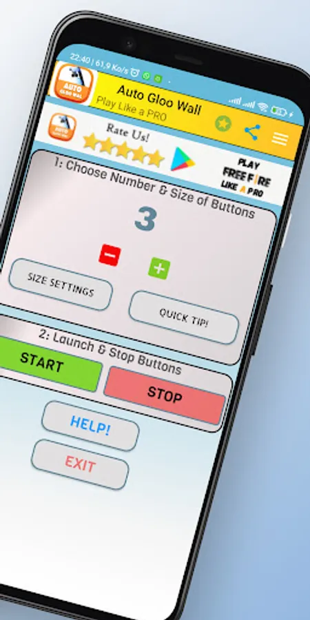 Choose how many floating buttons you want with (-/+) to use them on your game, then click "Activate" the app will close and your floating "Auto Buttons" will show up on your screen.