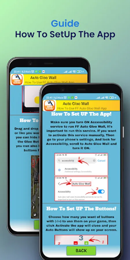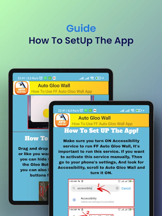Make sure you turn ON the Accessibility service to run "Auto Gloo Wall", It's important to run this service. If you want to activate this service manually, Then go to your phone's "settings", And look for "Accessibility", scroll to "Auto Gloo Wall" and turn it ON.