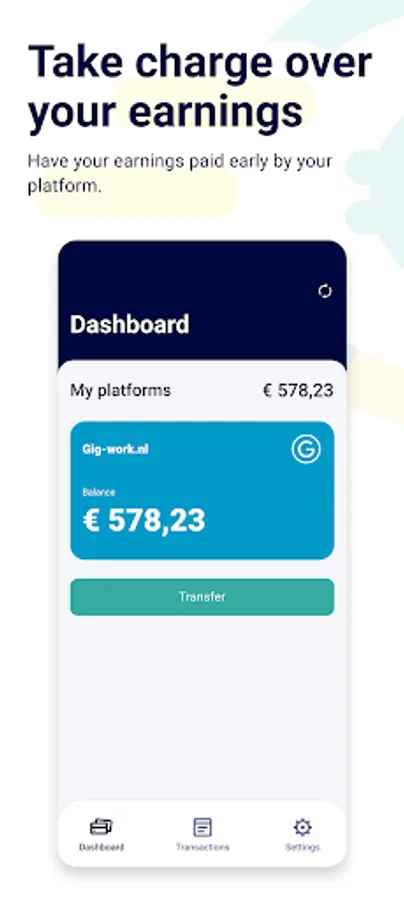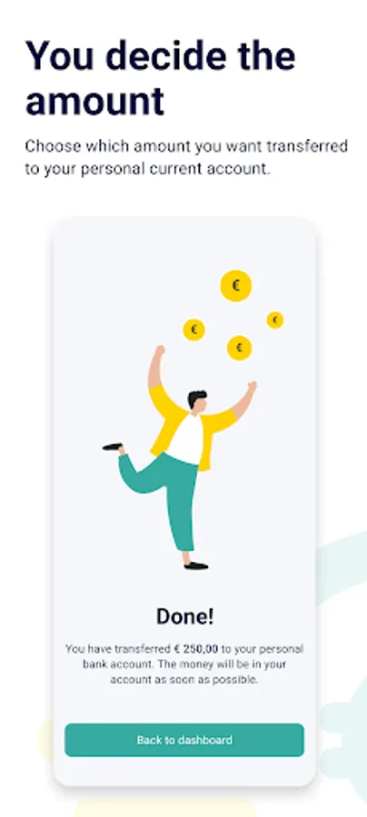 The Payday application enables you to better manage your income and finances. Payday visualizes your outstanding invoices or payslip-periods and offers instant payment, instead of having to wait for weeks to receive your earnings. Payday enables you to early pay-out your income, instantly and whenever you like! When you decide to take the money out early, transaction costs may apply depending on your platform. You will then see a detailed calculation of the actual amount you will receive in your bank account.