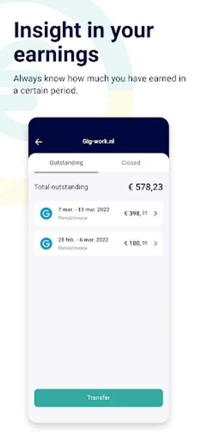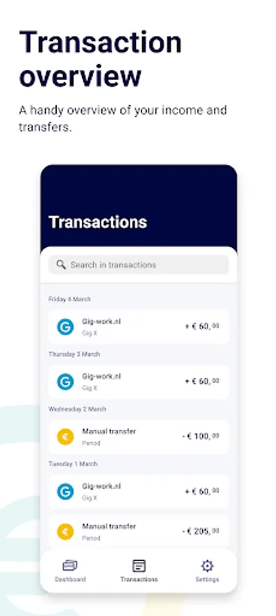 Besides outstanding earnings available for pay-out, the app also shows your income history. The details of your invoices or pay periods (including transactions) are securely* and clearly visualized in the Payday application. Everything in one place!