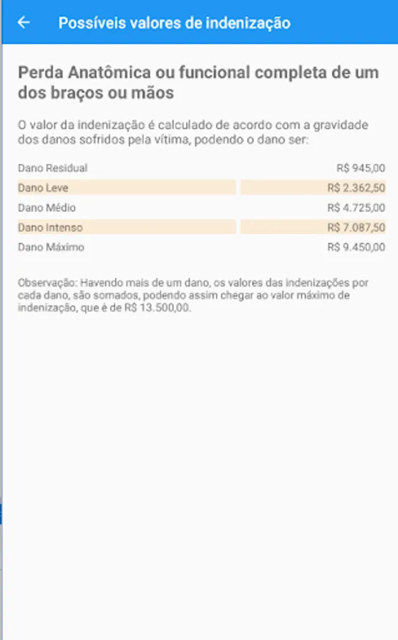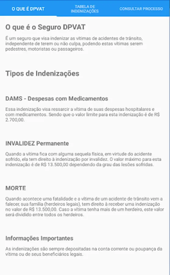 This app brings the table of compensation values for each type of injury sustained, doubts about the Safe DPVAT and allows the progress of the consultation process DAMS, Disability or Death.