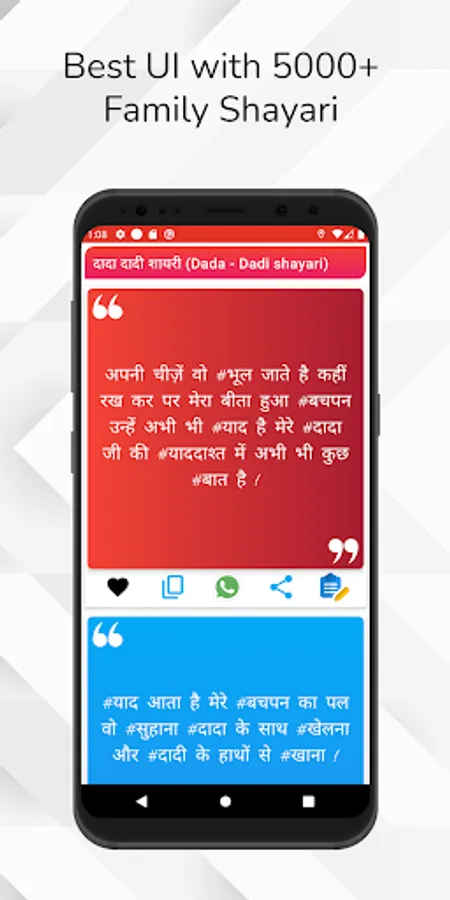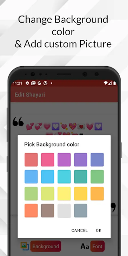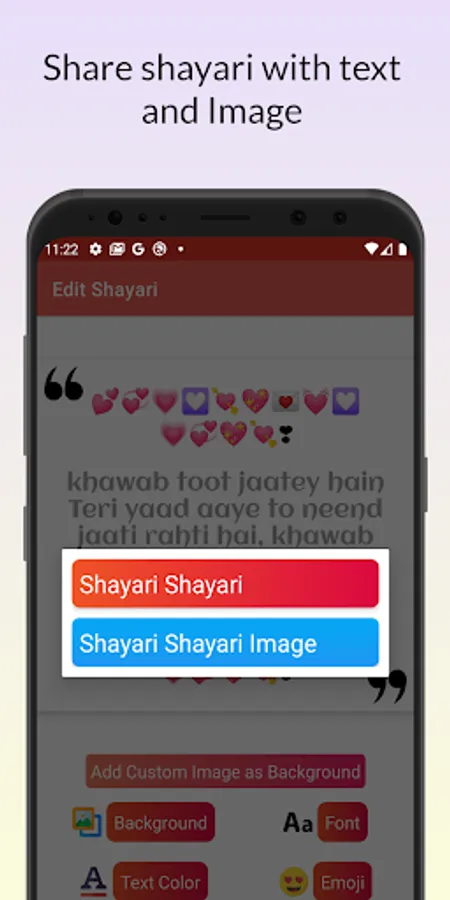 You can create your own status, quotes or Shayari with multiple stylish options like set background image using camera or gallery and also use predefined background images, change the font, text size, text colour & more.