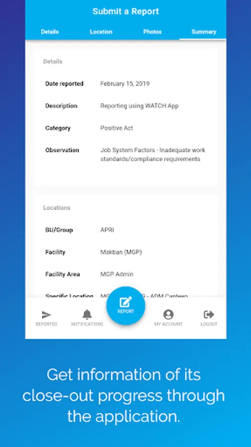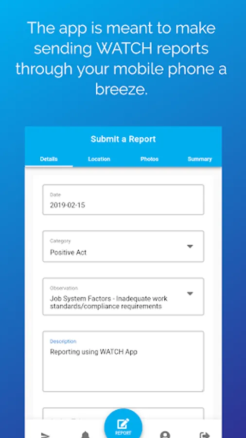 The application is a digital version of the WATCH Card. The app is meant to make sending WATCH reports through your mobile phone a breeze and get information of its close-out progress through the application.