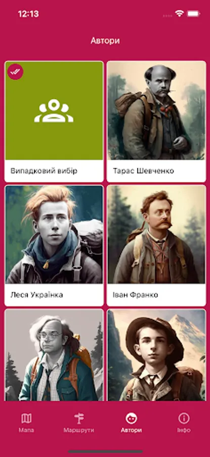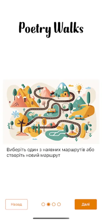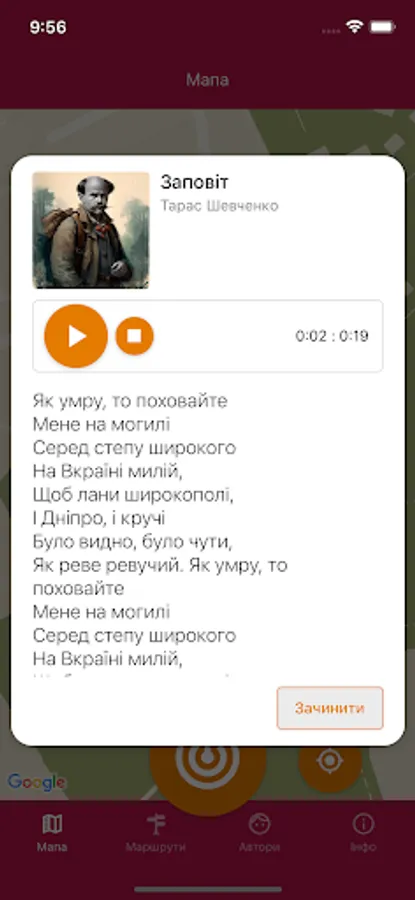 After reaching the next point on the route map, a small fragment of the poem opens. For our application, we chose the poetry of famous Ukrainian poets: Taras Shevchenko, Lesya Ukrainka, and many others.