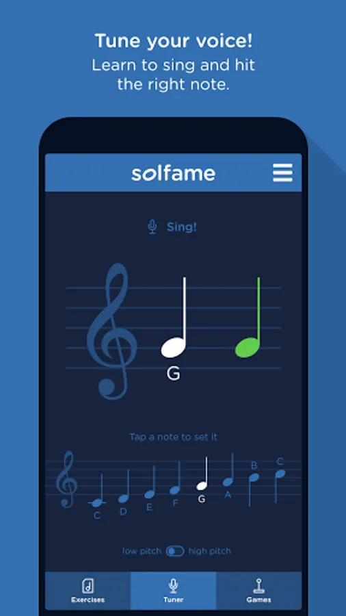 The app contains a tuner, in which you can tune your voice to the note you select, being able to see on a staff how close you are to singing the exact (midi) note. The tuner can also be used with the piano; use it to tune your instrument and get it ready to play. You can also use it to warm up your voice before singing.