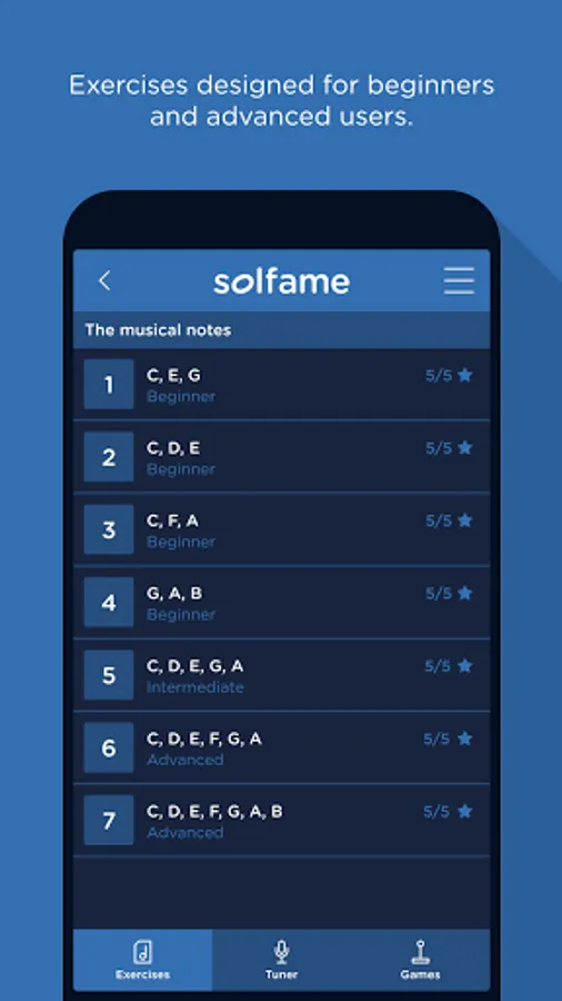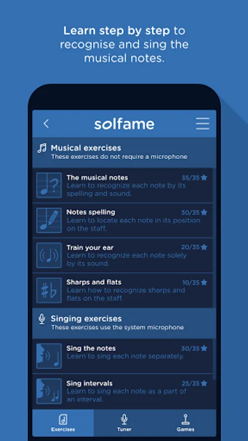 The exercise/challenge section is divided into different levels of difficulty (beginner, intermediate and advanced), with which you can start from scratch and progress in your learning. It contains a number of distinct types of exercises. Some in which you practise by singing using the microphone and other exercises in which the voice is not needed because the user interacts by screen touching with the purpose of learning the notation -spelling- and sound of the notes. In addition, it includes a scoring system with which to measure your progress.