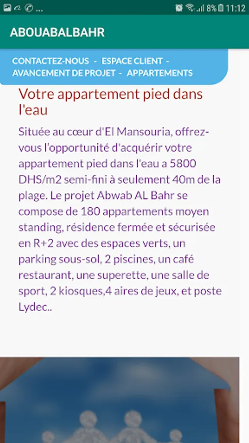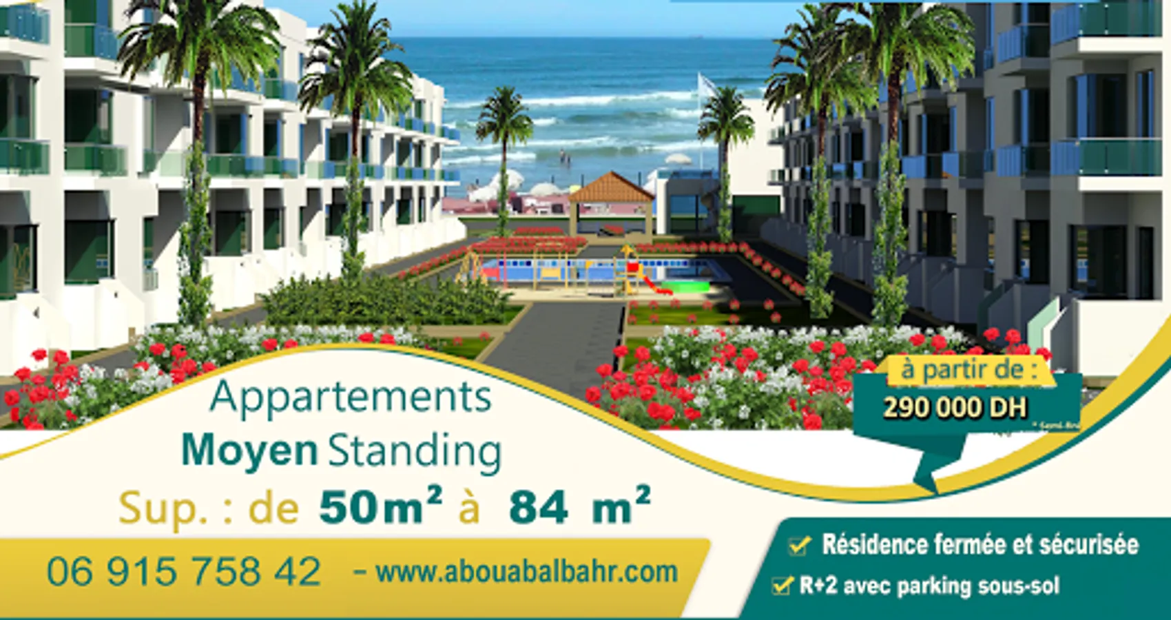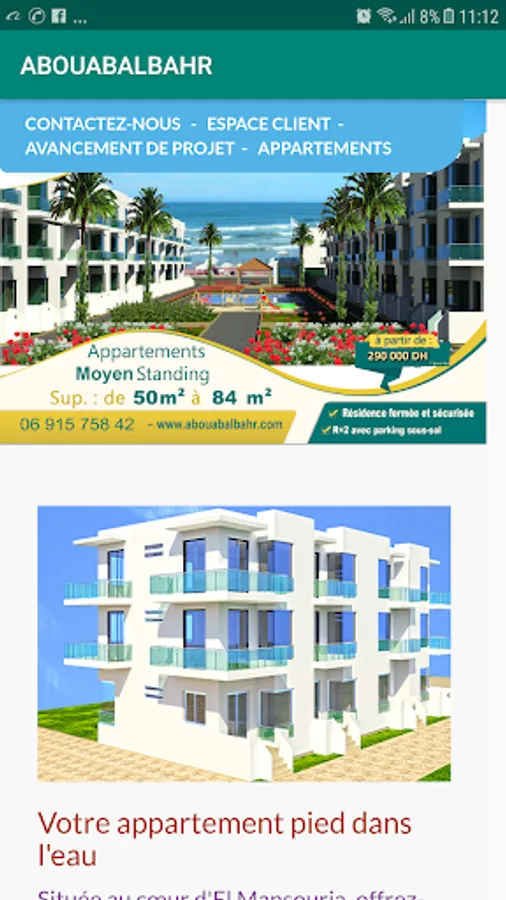 Your apartment in the water. Located in the heart of El Mansouria, give yourself the opportunity to acquire your apartment foot in the water at 5800 DHS / m2 semi-finished only 40m from the beach. The project Abwab AL Bahr consists of 180 apartments average standing, gated and secure R + 2 with green spaces, basement parking, 2 swimming pools, a café restaurant, a supermarket, a gym, 2 kiosks, 4 playgrounds, and Lydec station ..