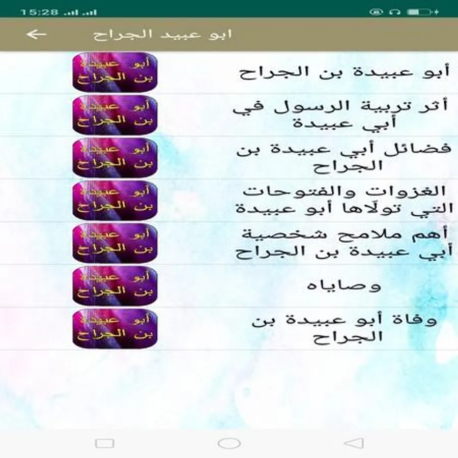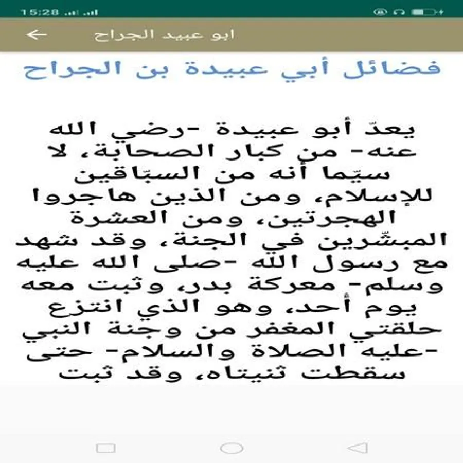 This application presents the biography of one of the greatest personalities in Islam and one of the greatest military leaders and warriors in Islamic history is the companion Abu Ubaid al-Jarrah - may God be pleased with him - sword of God and his full name Abu Sulaiman Abu Ubaidah Amer bin Abdullah bin Jarrah al-Fihri al-Qurashi, an Islamic figure that had Significant impact in spreading the Islamic religion, and the call to God Almighty, which is one of the missionaries of heaven, as the application gives a brief summary on this hero and you will find in the application of the characteristics of Abu Ubaidah bin Al Jarrah and Abu Ubaidah bin Al Jarrah his death and Abu Ubaidah bin Al Jarrah in the battle of Uhud and Abu Ubaidah bin Al Jarrah to Shiites Abu Ubaidah al-Jarrah and the plague, and he is one of the most important men around the Messenger and the call to God Almighty. These men are: Musab bin Omair, Salman Al-Farisi, Abu Dhar Al-Ghaffari, Bilal bin Rabah, Abdullah bin Omar, Saad bin Abi Waqas, Suhaib bin Sinan, Muath bin Jabal, Al-Miqdad bin Amr, Saeed bin Amer, Hamza bin Al-Muttalib, Abdullah bin Masoud, Hudhaifa bin Al Yaman, Amer bin Yasser, Ubada bin Al-Samet, Khabat bin Al-Art, Abu Ubaidah bin Al-Jarrah and you will find in the application Abu Ubaidah took the reign of Al-Sham and died from the plague of Amos from the signs of the hour
