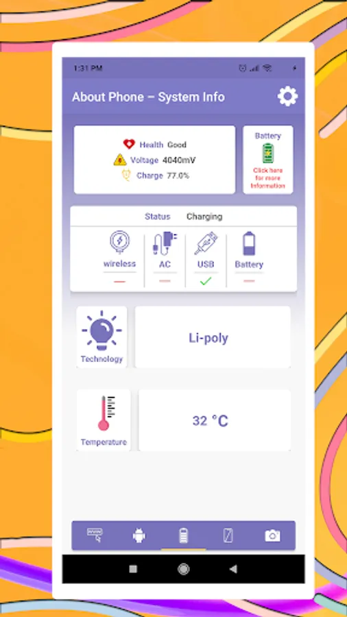 Device info: System: Hardware gives software information about 100+ hardware specs and features, as well as real-time information on battery, RAM, and WiFi internet data and the battery temperature.