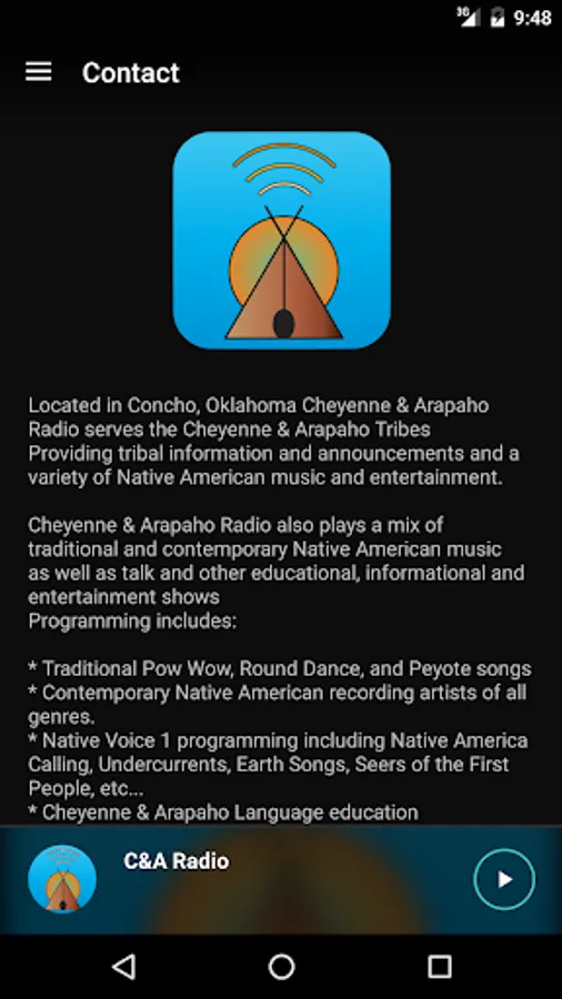 Cheyenne & Arapaho Radio also plays a mix of traditional and contemporary Native American music as well as talk and other educational, informational and entertainment shows