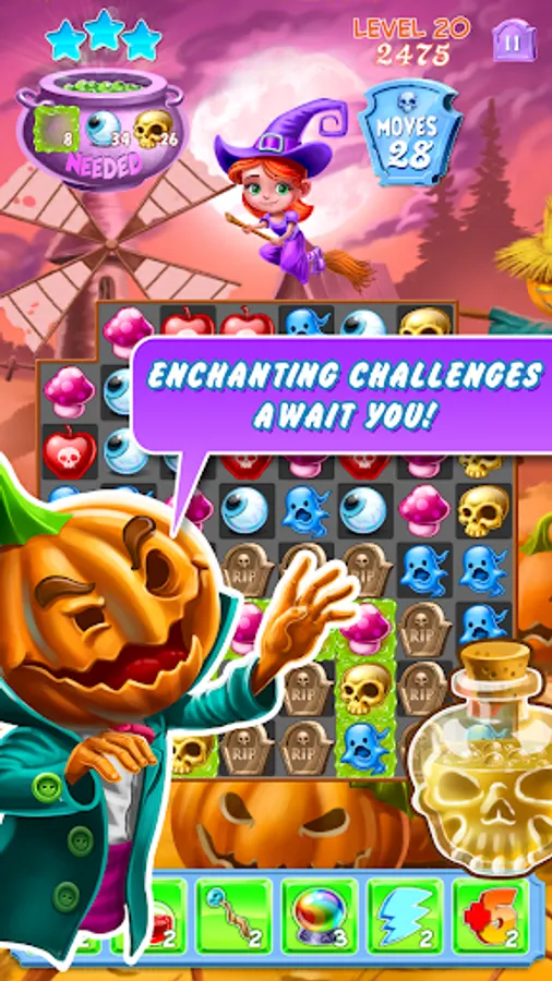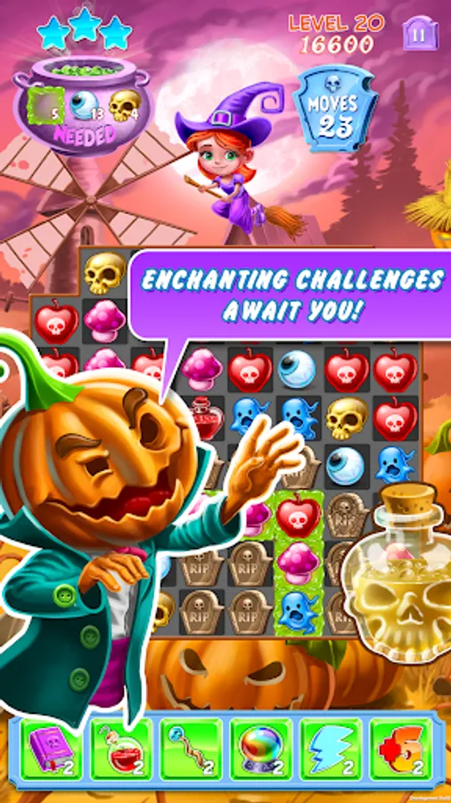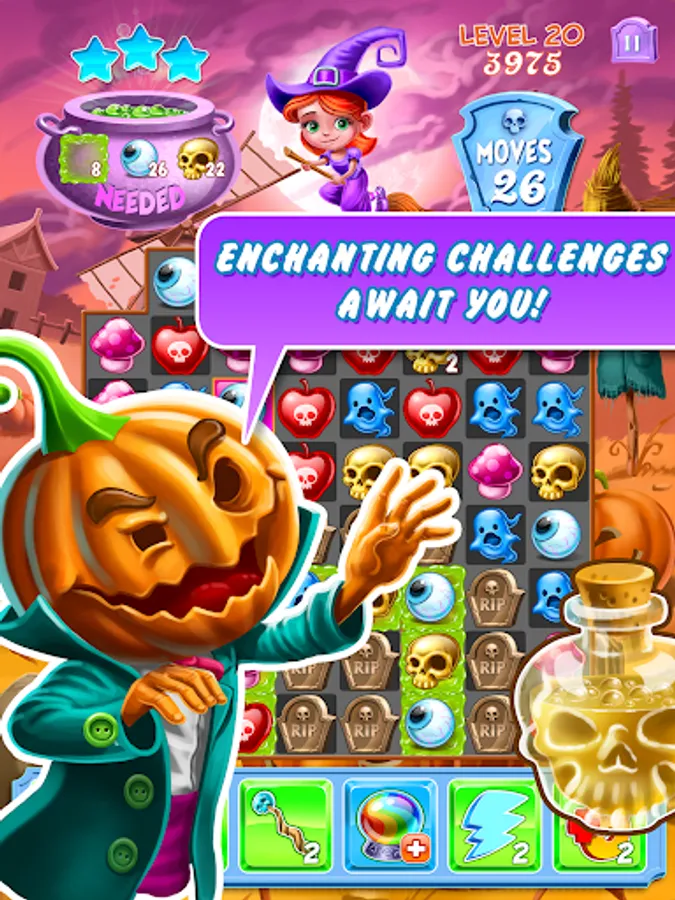 Travel through deserted villages, dark forests and spooky cemeteries matching spell ingredients and creating amazing potions in this magical match-3 puzzler. Be careful in your journey, though, as the evil Pumpkinhead is after you, trying to prevent you from learning magic!