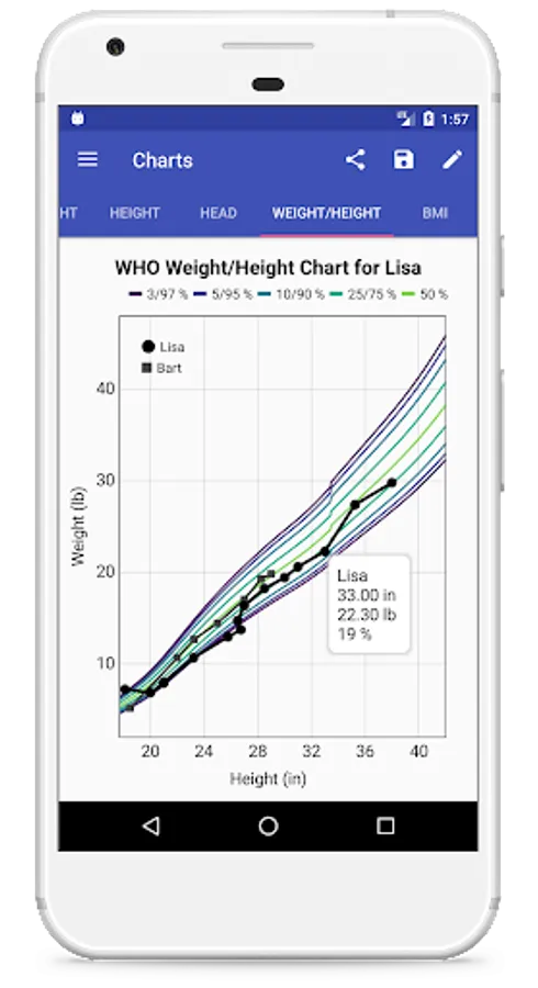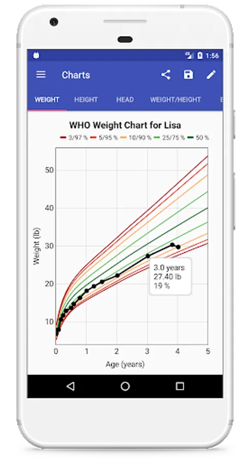 You can save images of your child's charts or percentile tables to share, put in a baby book, or take along to discuss with your child's doctor. Easily export and import data to an open CSV format. Compare multiple children's growth curves, or enter a parent's data and compare child with parent. Project children's growth out to the full growth chart.