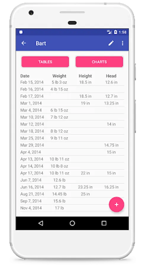 Record multiple children's weight, height, and head circumference measurements and use them to generate growth charts and percentiles from birth to age 23 for some measurements.