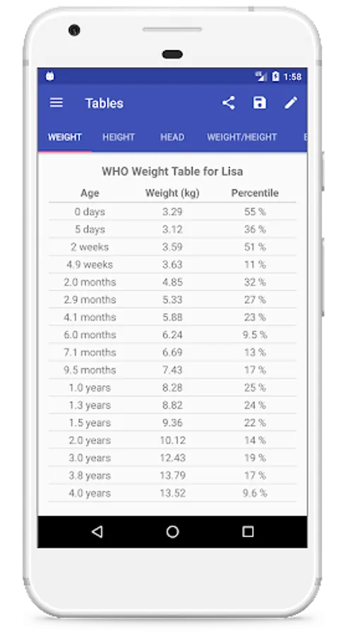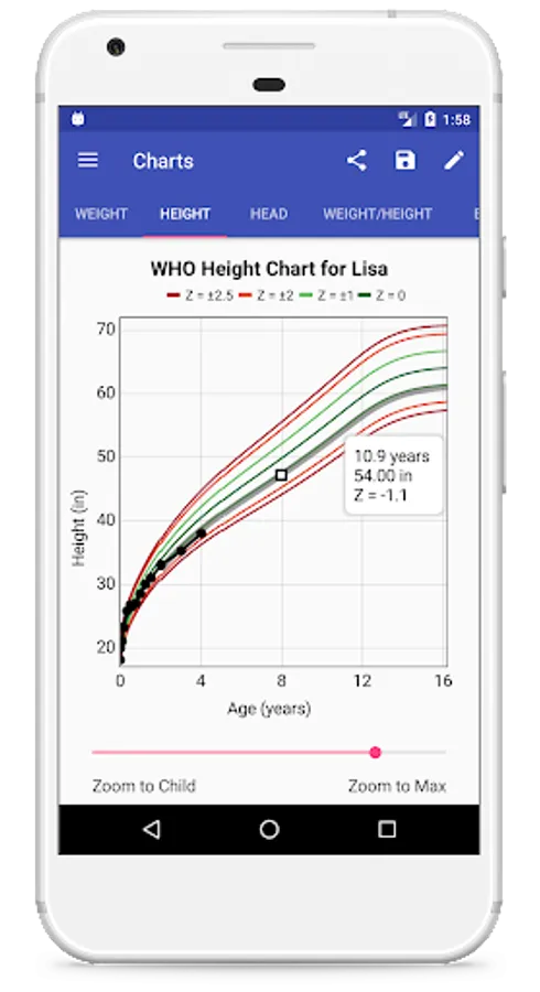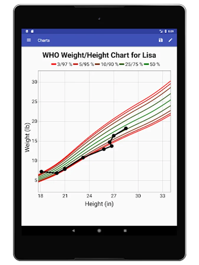 You can save images of your child's charts or percentile tables to share, put in a baby book, or take along to discuss with your child's doctor. Easily export and import data to an open CSV format. Generate a PDF report with a growth chart and percentile table. Compare multiple children's growth curves or enter a parent's data and compare child with parent. Project growth up to the end of each curve.