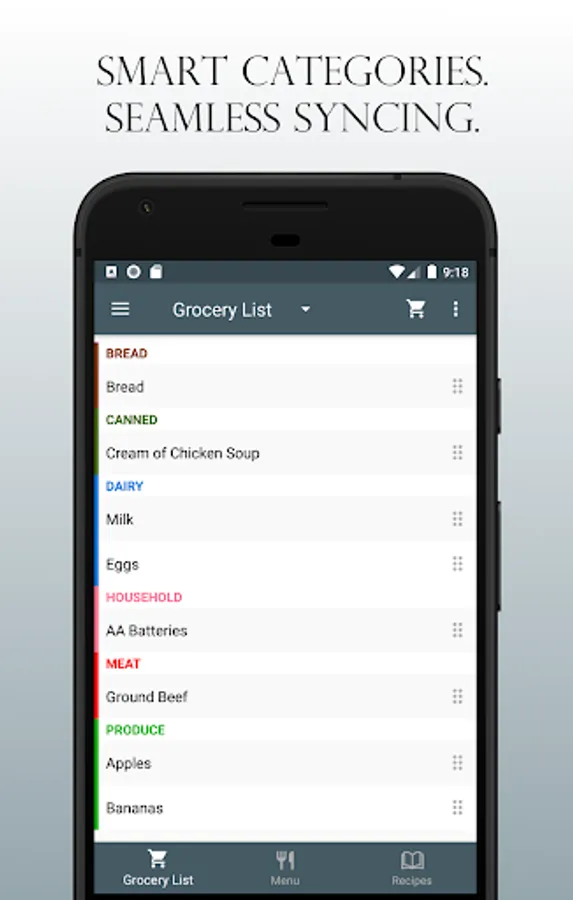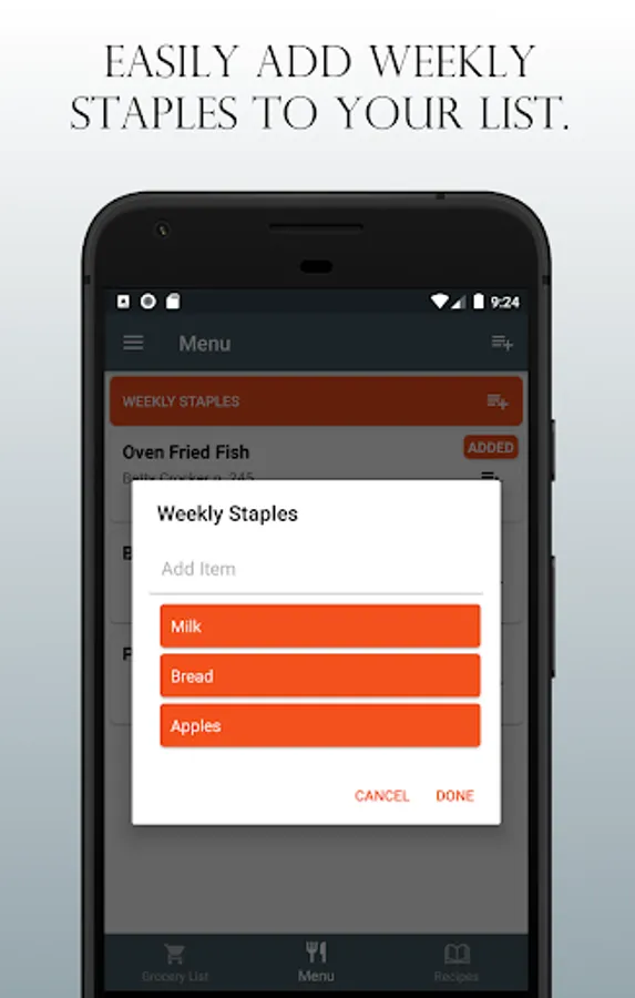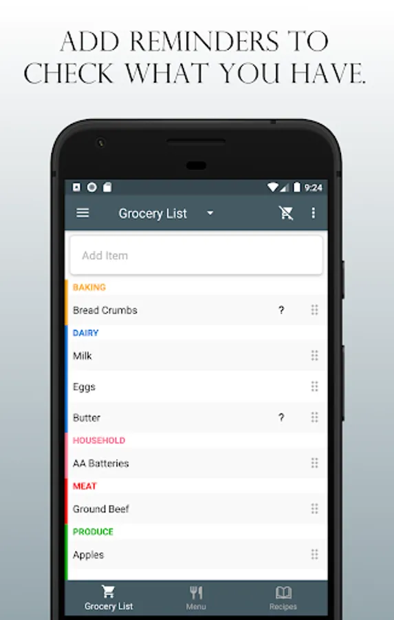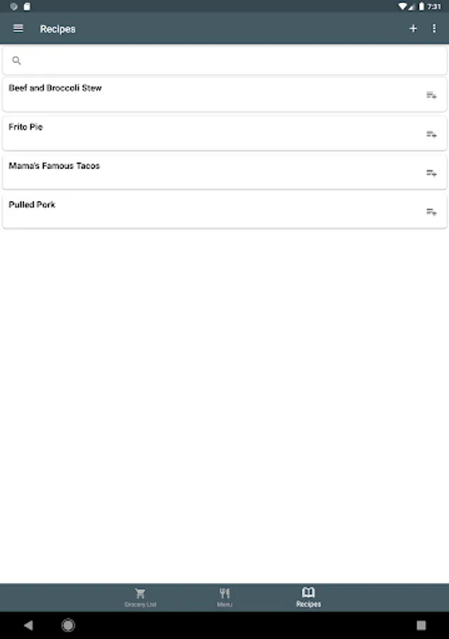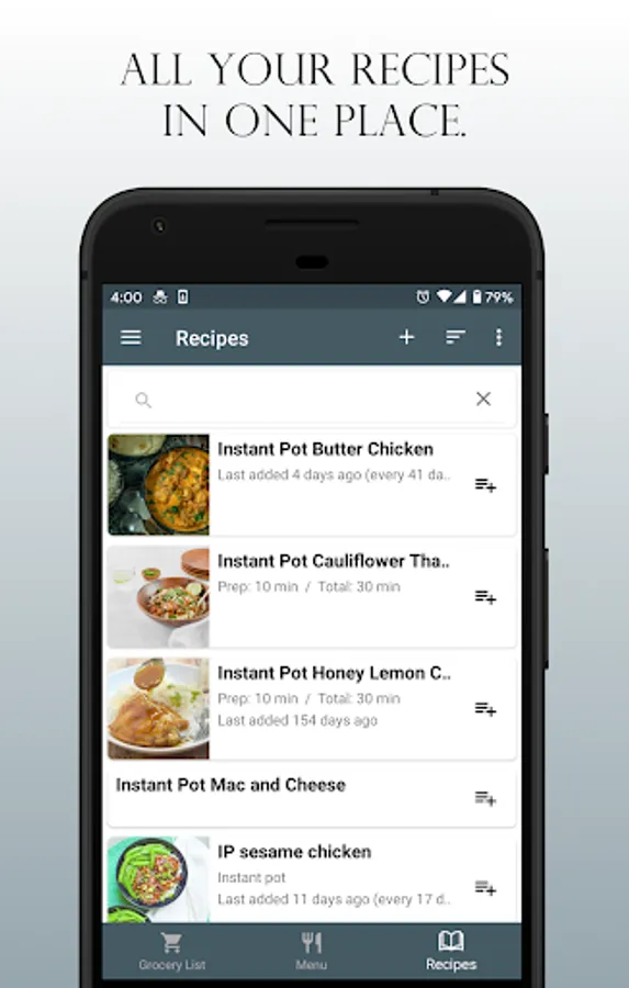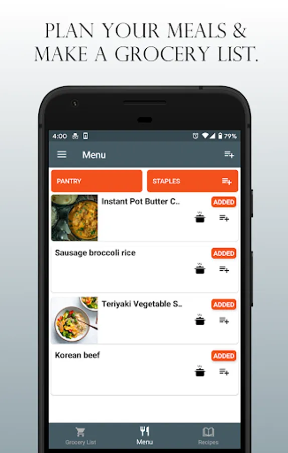 Keep your recipe ingredients, meal plan, and grocery list all in one place! With Grocery Pro, you can build up a database of the recipes you cook with their ingredient lists, quickly select recipes to cook for meals, and automatically add all the ingredients to your shopping list.