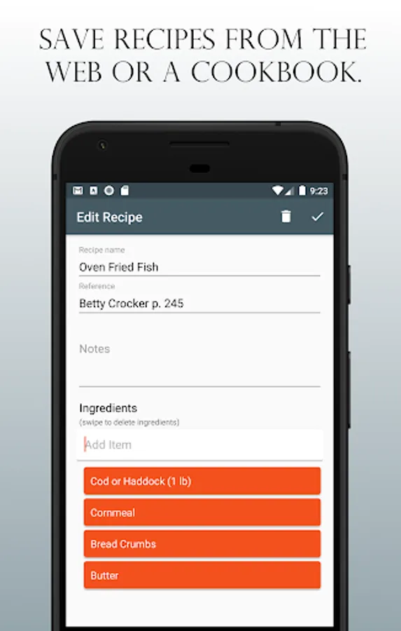 * Manual recipe entry lets you store ingredients from your favorite cookbook or handwritten recipe