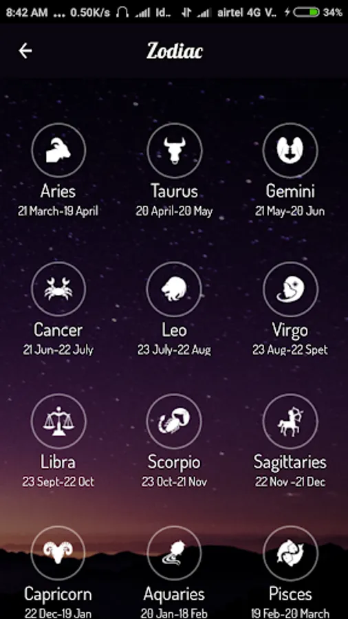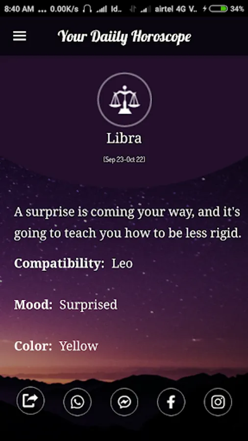 This app shows your daily horoscope with compatibility, colour and Mood. You can also share daily horoscope through sms or whatsapp.