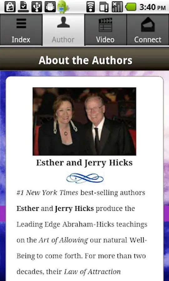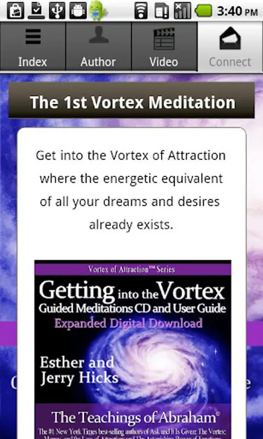 This guided meditation digital recording and book from New York Times best-selling authors Esther and Jerry Hicks explains how "getting into the Vortex" is essential for manifestation using the Law of Attraction. Gain an understanding of what the "Vortex of creation" means and how you can use meditation to enter the vortex in order to allow the Law of Attraction to work for you. Also gain valuable insights about what happens to your affirmations and manifestation efforts when you are out of the Vortex. Five guided meditation audio sessions with music are included in this app.