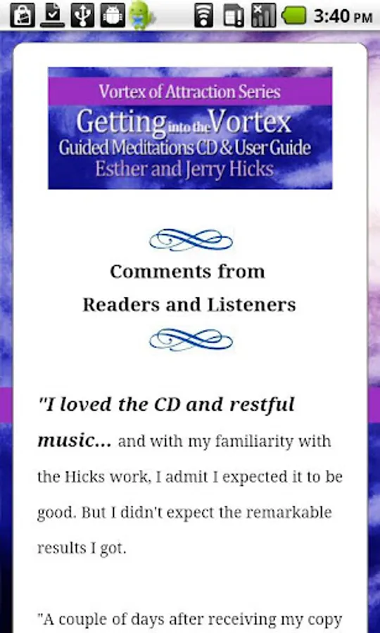 "Getting Into the Vortex Guided Meditations and User Guide" has received 4 1/2 out of 5 stars on Amazon.com and the physical product was sold out on the second day after its release.
