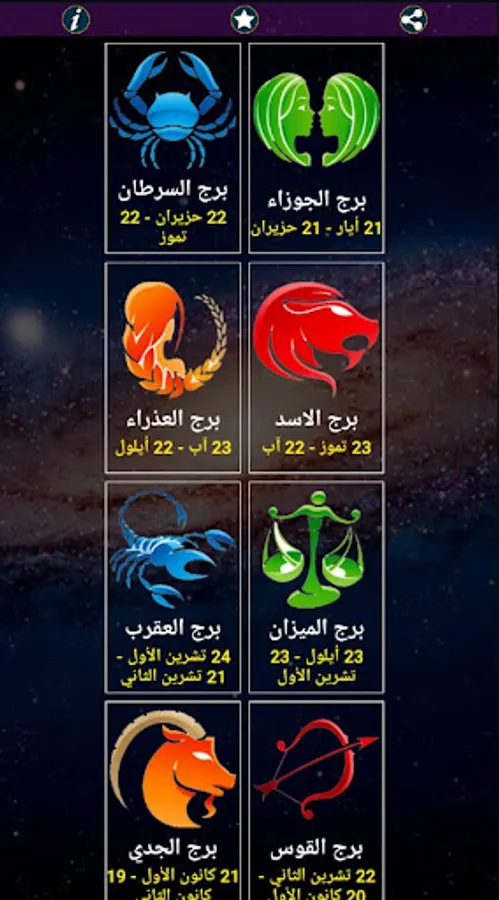 The application contains Aries, Taurus, Gemini - Cancer, Leo, Virgo, Libra, Scorpio, Sagittarius, Capricorn, Aquarius and Pisces