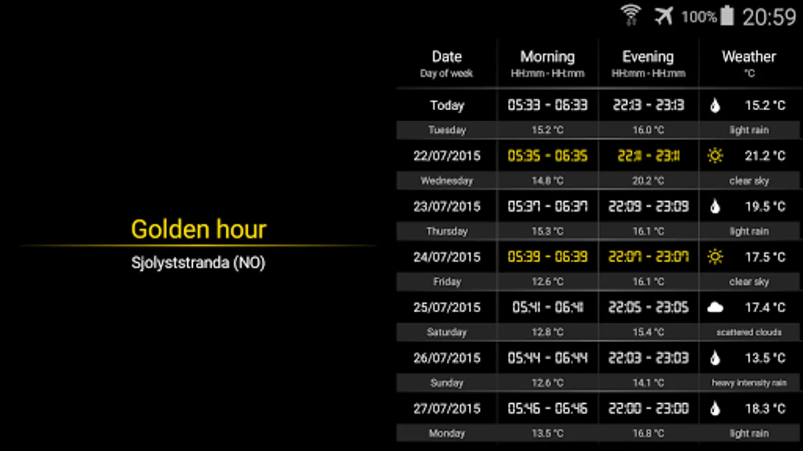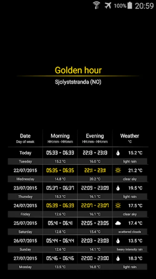 - Best possible pictures: Golden time viewer - know the exact time frame to take amazing photos, taking the weather into account
