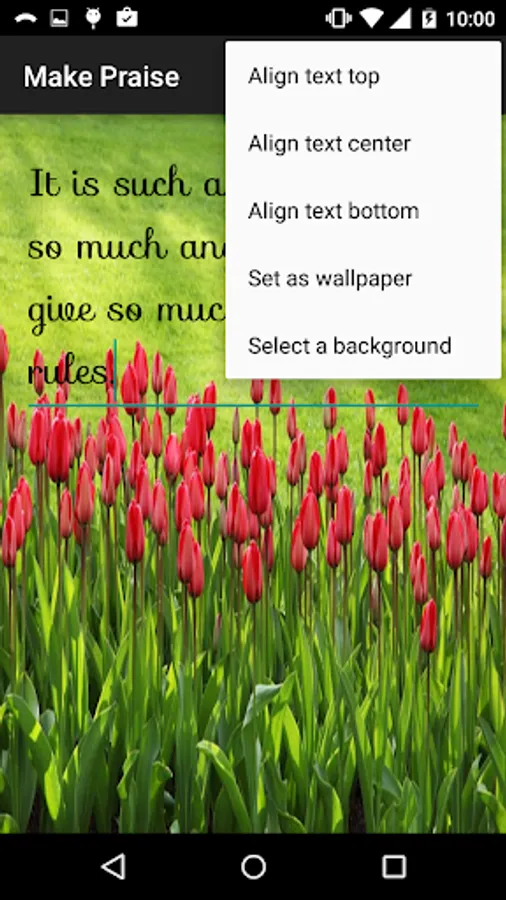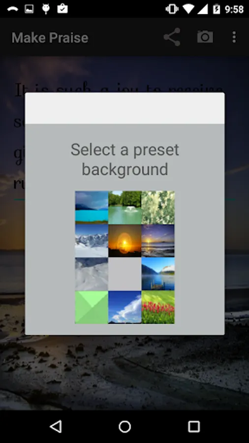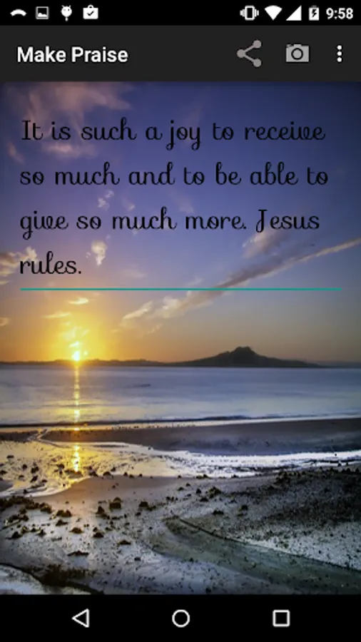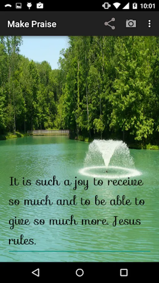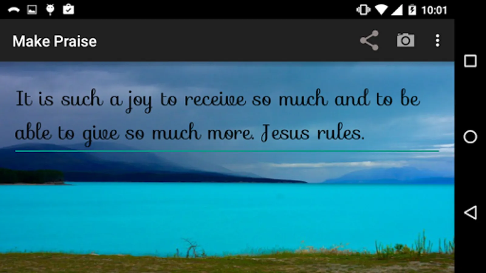 -The **Make Praise** feature (my personal favorite) which allows users to make and share 'visual or graphical praises'. Users may enter a testimony or some words of praise to the Lord or even encouragement or inspiration then select one of the beautifully preset backgrounds or capture images with their photos to create the graphical praise. Once the visual praise is ready the user may: