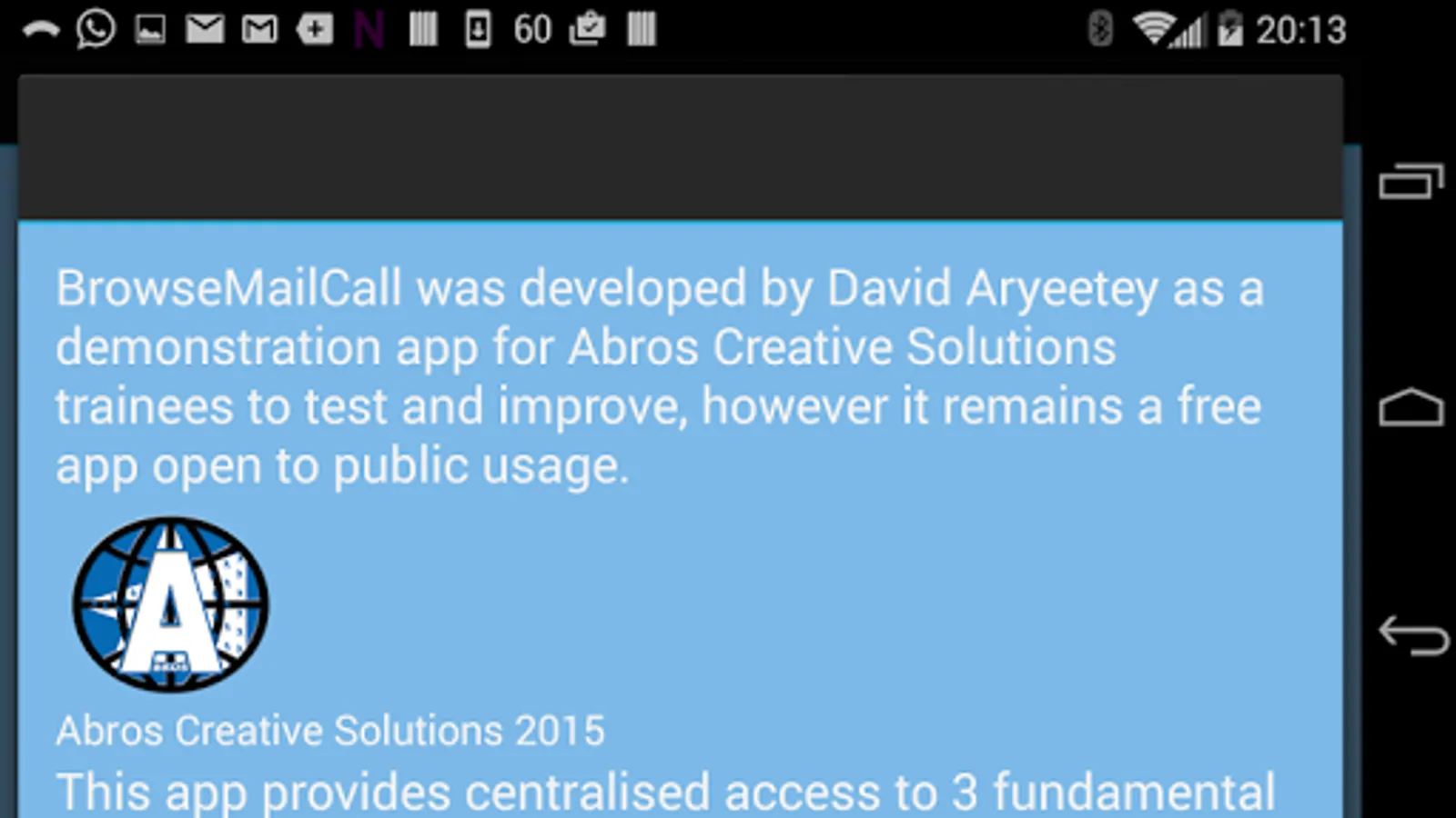 BrowseMailCall was developed by David Aryeetey as a demonstration app for Abros Creative Solutions trainees to test and improve, however it remains a free app open to public usage.