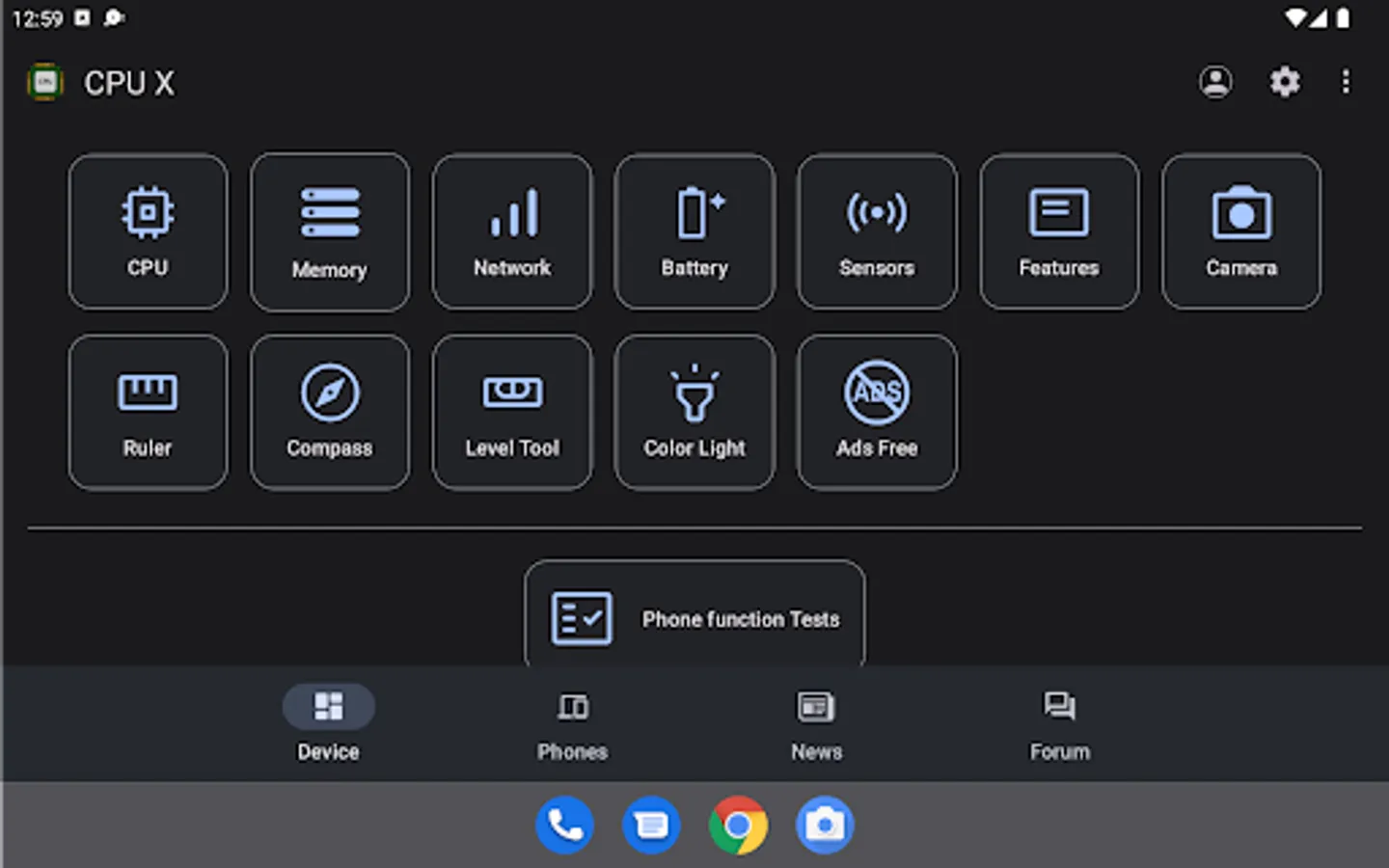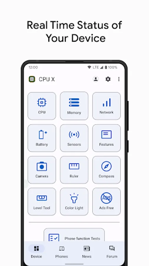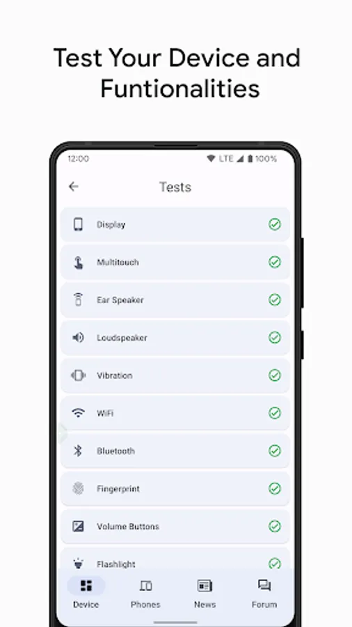 • Tests - test your device's functionalities like Display, Multitouch, Ear Speaker, Loudspeaker, Microphone, Vibration, Wi-Fi, Bluetooth, Fingerprint, Volume Buttons, Flashlight, Headset Jack and Charging Port.