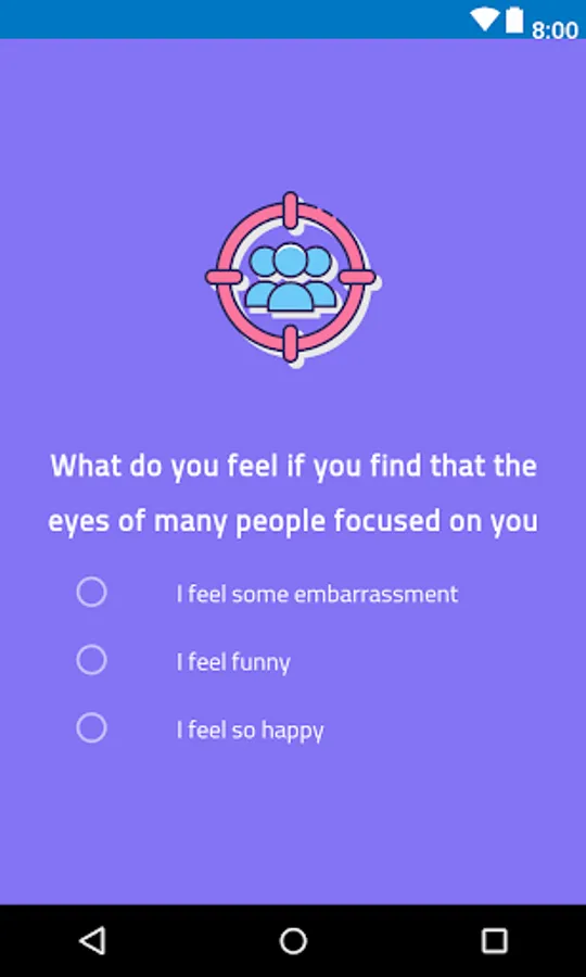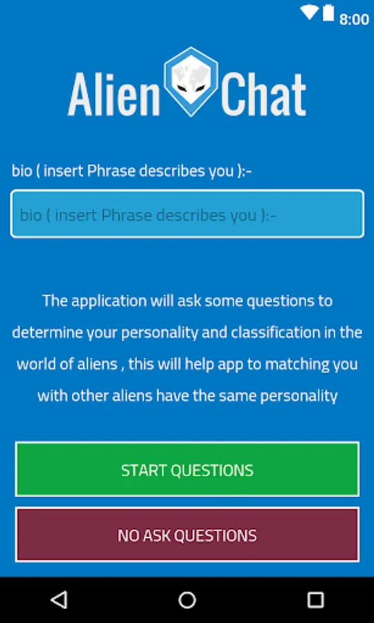 1- app will ask you five questions and then analyze your personality characteristics , then give you slogan to your personality etc air, earth, fire, water, this will help another aliens to find the aliens that have the same personality and communicate together.