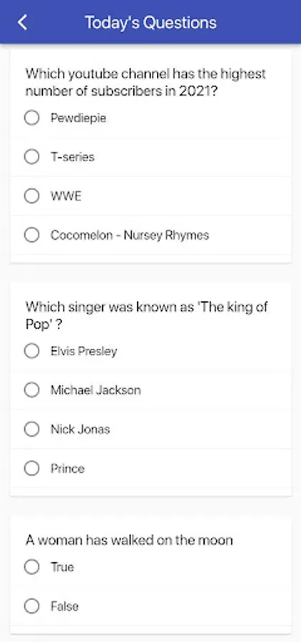 This quiz app is designed to keep users engaged and learning with interesting and challenging general knowledge questions. The questions cover a variety of topics and are designed to test users' knowledge and stimulate their minds. Whether you're a trivia enthusiast or just looking to keep your brain active, this app is a great way to challenge yourself and have fun while doing it.