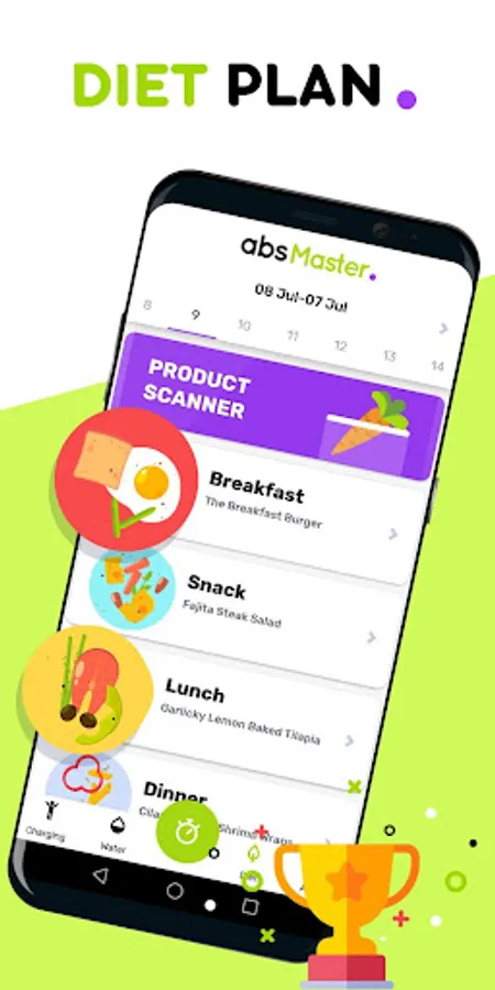 Speaking of nutrition. In our abs workout app you will also find a daily meal plan with recipes and essential products. You will receive a step-by-step recipe, how to prepare yourself a healthy breakfast, lunch, dinner and snack. These recipes will facilitate your weight loss in 30 days!