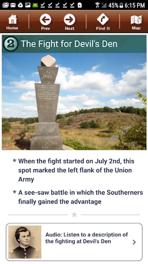 The Gettysburg Battle App®: July 2 is the perfect tour partner for your visits to some of the Gettysburg battlefield's most famous places, Devil's Den and Little Round Top. This GPS-enabled tour app focuses exclusively on the July 2, 1863 fighting and provides in-depth detail on the action that took place on this iconic historical landscape. Click on our "virtual signs" to access a wealth of information related to the very location where you are standing. Onboard historian videos, audio accounts from soldiers and civilians, photos, facts, and more are just a click away. Never has so much information been made available in such a portable device!