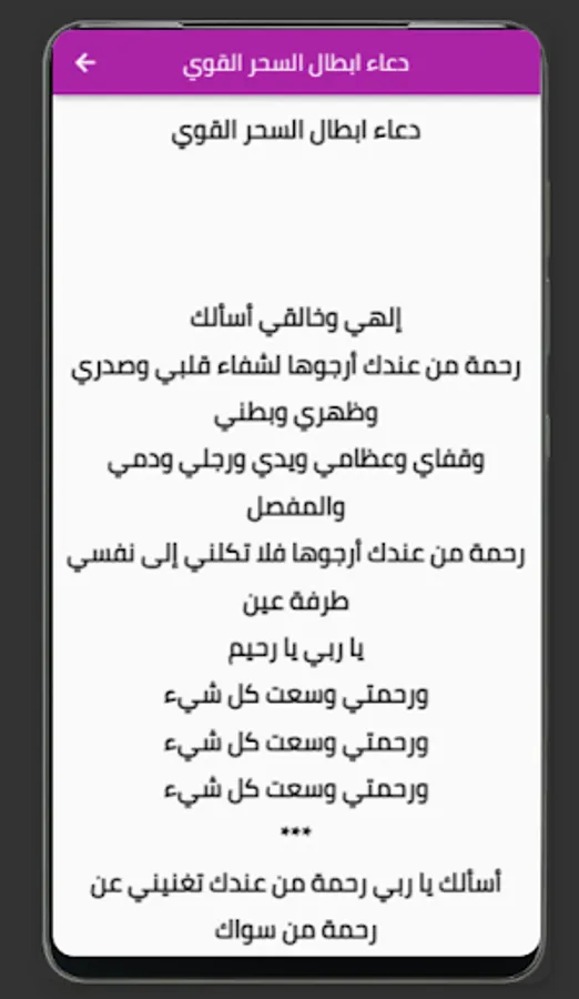 The application contains a large collection of verses used to nullify magic, including: Ayat Al-Kursi, Surat Al-Fatihah, I seek refuge in Allah from the accursed Satan, Surat Al-Baqara, and many others. Users can also add verses that they find useful to them.
