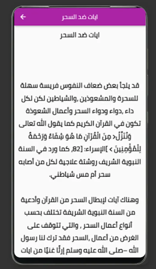 The application "Verses to nullify witchcraft" provides a set of well-known and proven Qur'anic verses to nullify witchcraft and protect against it, in order to help users get rid of this evil and protect themselves and their loved ones. The application has an easy-to-use interface and a beautiful design that makes it fun and useful to use.