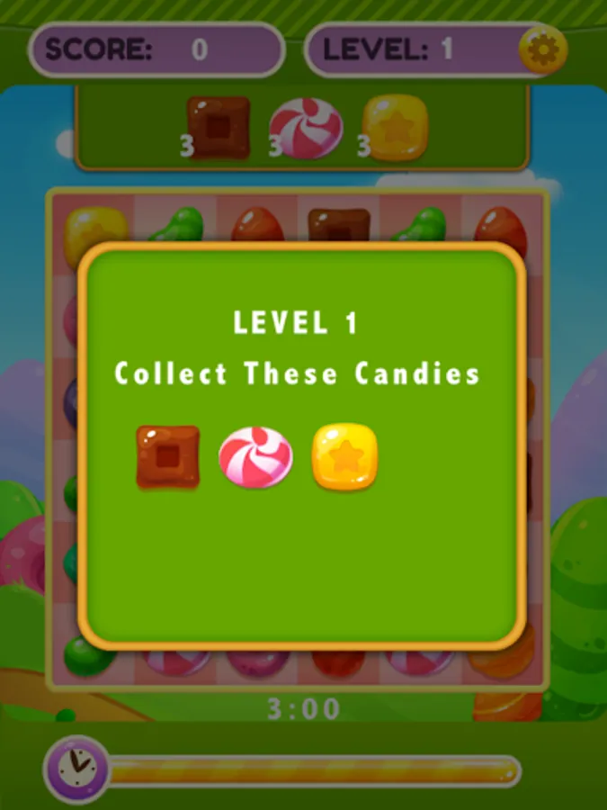 Play Sweet Candy Blast with more than 500 levels, filled with lot of fun and challenges, Try to match the Candies to get high score and progress to next levels, also you can use powerups like bombs to help you match the Candies.