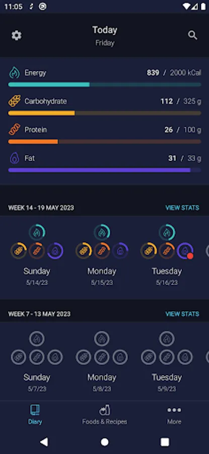 - Food diary: food journal with meals logging, view day grouped by week or by month