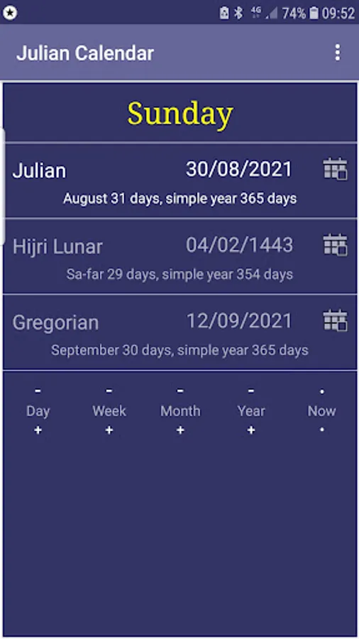 The Julian calendar has two types of years: a normal year of 365 days and a leap year of 366 days. They follow a simple cycle of three normal years and one leap year, giving an average year that is 365.25 days long. That is more than the actual solar year value of 365.24219 days (the current value, which varies) which means the Julian calendar gains a day every 128 years. For any given event during the years from 1901 to 2099 inclusive, its date according to the Julian calendar is 13 days behind its corresponding Gregorian date.