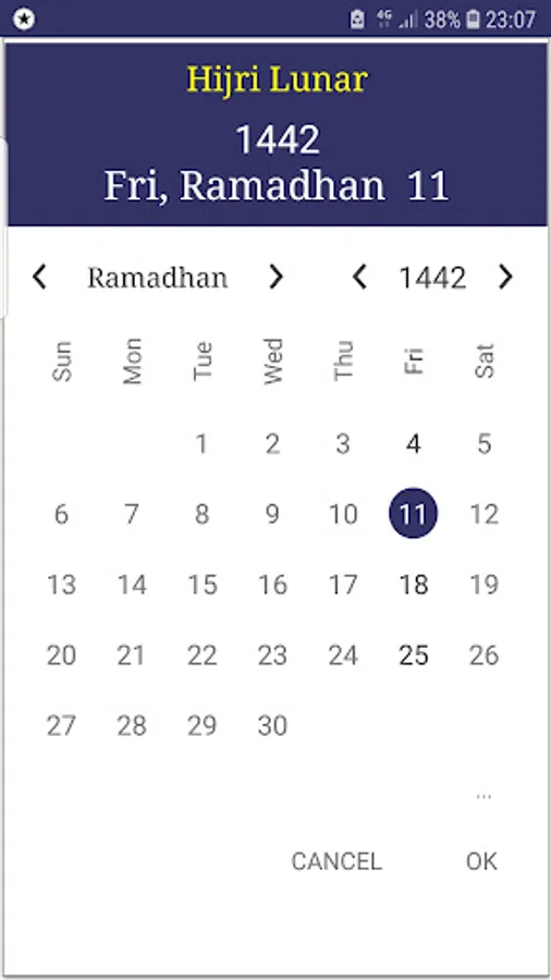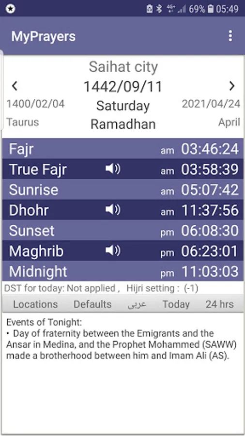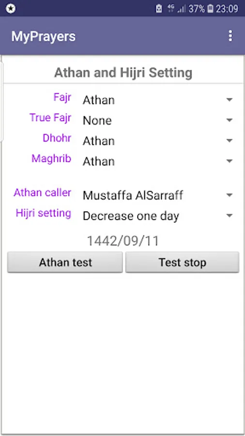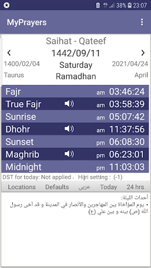• MyPrayers app displays the standard lunar calendar, with the ability to set it to match with the official or legal calendar by increasing or decreasing up to three days.