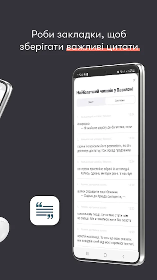 - easy bookmarking while listening to audio and reading, which allows you to save and find important quotes;