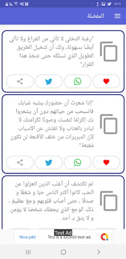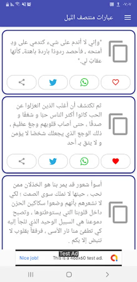 When browsing night thoughts, you can copy or share them via (WhatsApp - Twitter - Facebook - text message) and other means of communication with the click of a button.