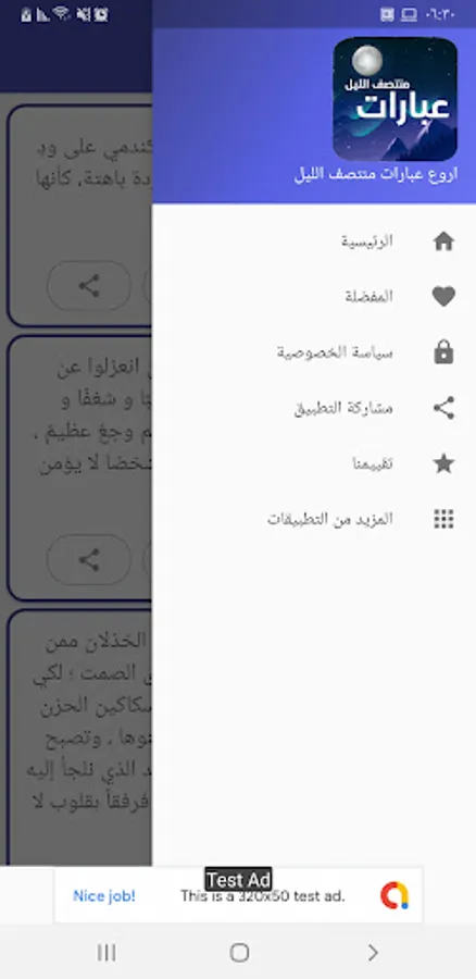 When connected to the Internet, the latest statuses about the night are downloaded, and to facilitate your access to the phrases you liked, click on the heart icon to save it in your favorites that you can access via the side menu.