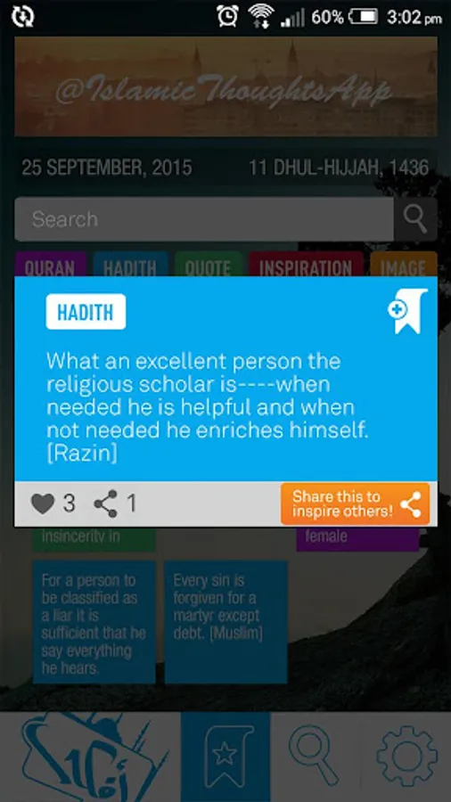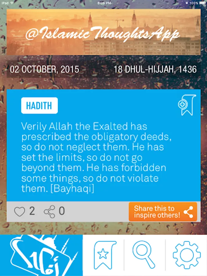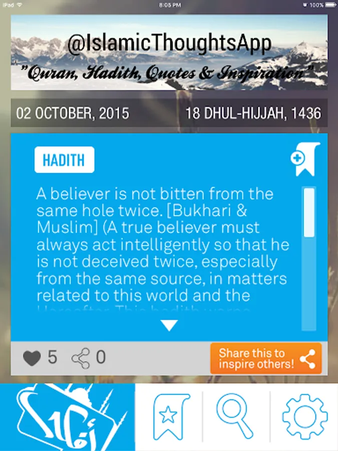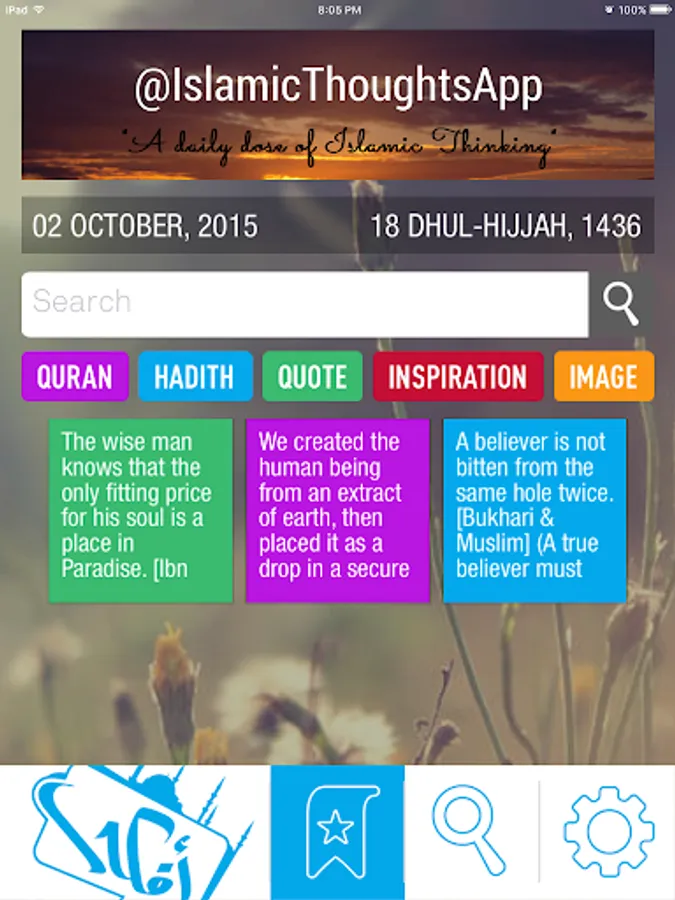 Islamic Thoughts is a daily dose of inspiration in the forms of Ayat from the Quran, Ahadith, Quotes from Scholars, Images and General Inspiration, providing you with Islamic Food for Thought & Islamic Thinking. Get your Hadith of the Day.