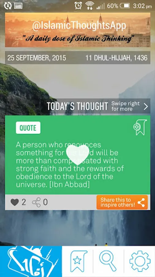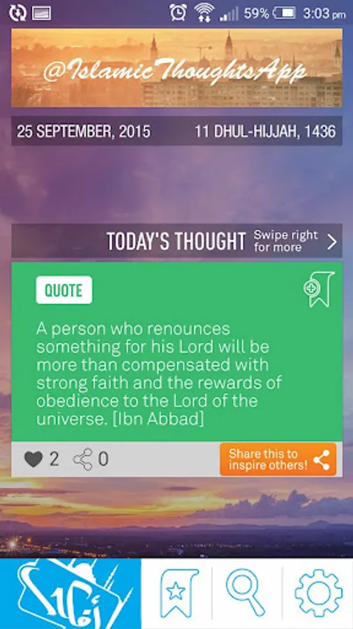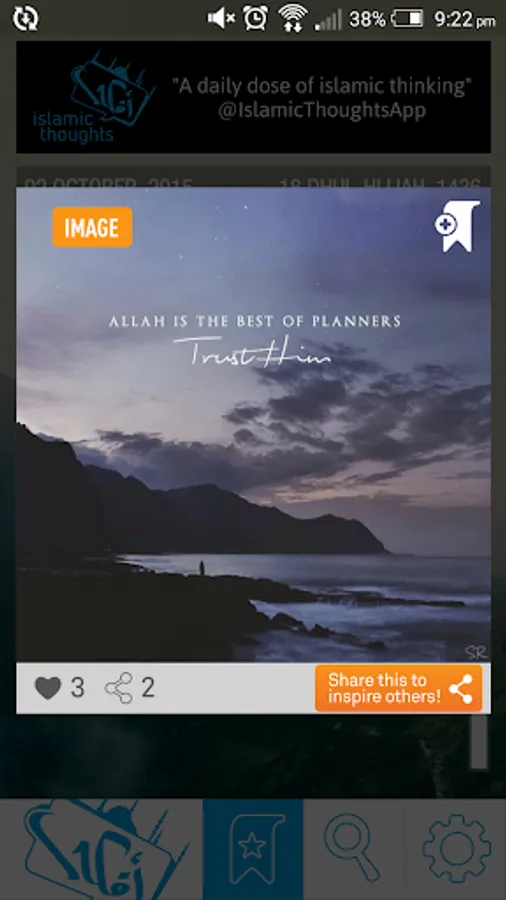 Browse and swipe through the thought cards, bookmarking your favourite cards so you can access them later. Search our extensive database via keywords to find inspiring and thoughtful messages to boost your faith and increase your knowledge. Enable Notifications to get one sent to your phone when your Daily Islamic Thought is ready. Like and Share the thoughts to various platforms and social media to inspire others! (WhatsApp, Facebook & more)
