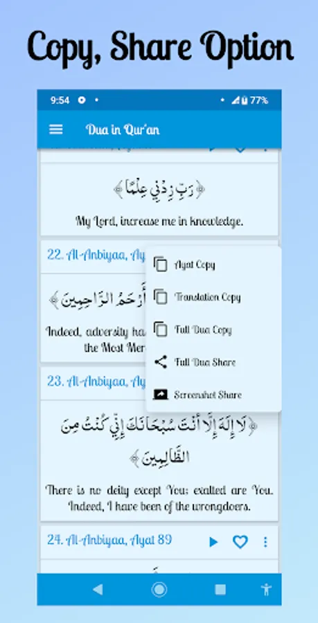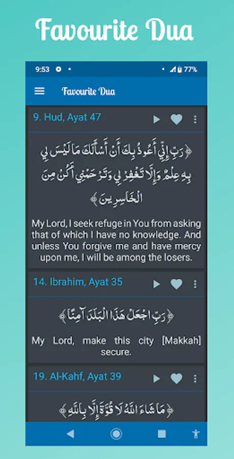 √ Each Dua is displayed in Arabic with its translation and word by word meaning.