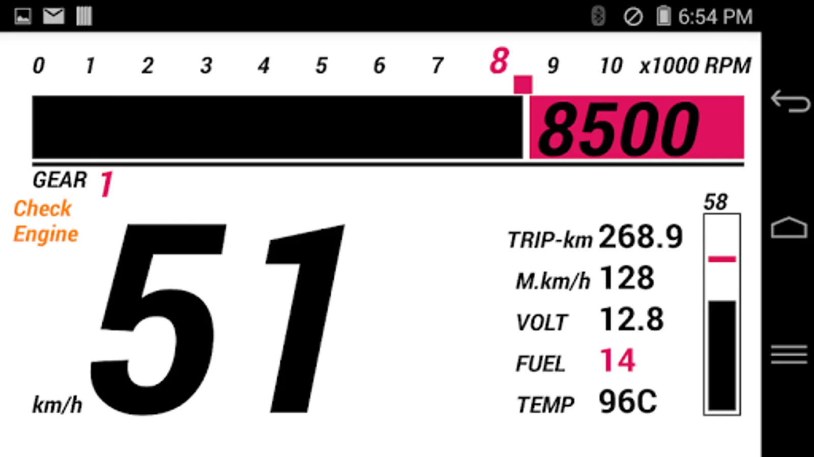 - Turns your Android phone to an useful digital instrument panel showing your car's RPM, speed, throttle position, shifting indication, coolant temp, voltage in a colorful and easy to glance layout.