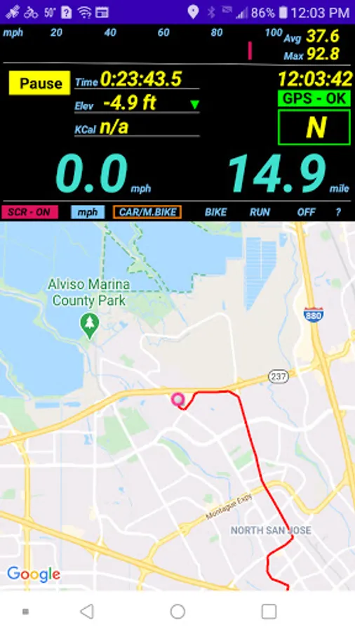 It boasts a clean and high contrast info display showing your current speed, heading direction, traveled distance, elapsed time, current elevation, and calories burned.