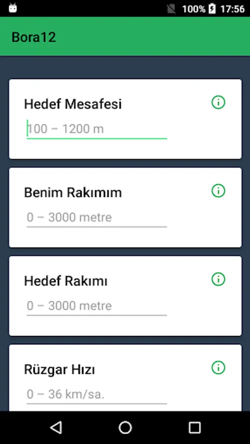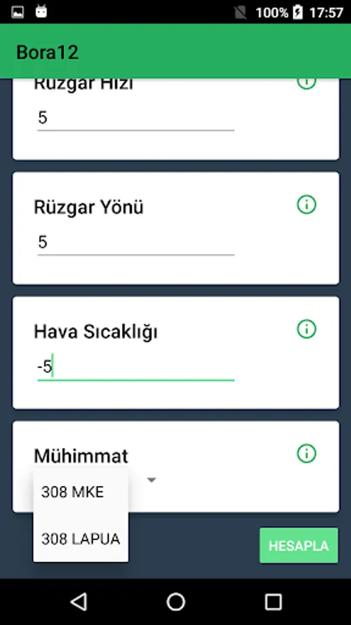 Bora12 Ballistics Calculator App is designed only for Bora12 Sniper weapon. Projectile can calculate and ammunition information is pre-installed. So you can get without having to deal with detail quickly result in six steps. The language is Turkish and is easy to use for users at every level.