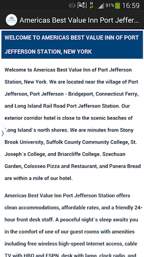 Welcome to Americas Best Value Inn of Port Jefferson Station, New York. We are located near the village of Port Jefferson, Port Jefferson - Bridgeport, Connecticut Ferry, and Long Island Rail Road Port Jefferson Station. Our exterior corridor hotel is close to the scenic beaches of Long Island's north shores. We are minutes from Stony Brook University, Suffolk County Community College, St. Joseph's College, and Briarcliffe College. Szechuan Garden, Colosseo Pizza and Restaurant, and Panera Bread are within a mile of our hotel.Americas Best Value Inn Port Jefferson Station offers clean accommodations, affordable rates, and a friendly 24-hour front desk staff. A peaceful night's sleep awaits you in the comfort of one of our guest rooms with amenities including free wireless high-speed Internet access, cable TV with HBO and ESPN, desk with lamp, clock radio, and free local calls. At Americas Best Value Inn Port Jefferson Station, We've Got You Covered from the time you hit the road until your head hits the pillow.
