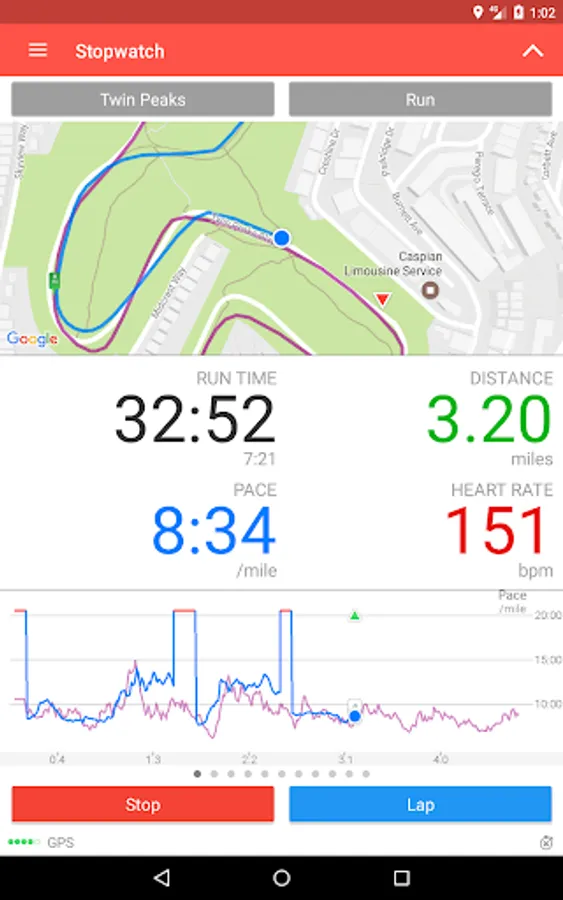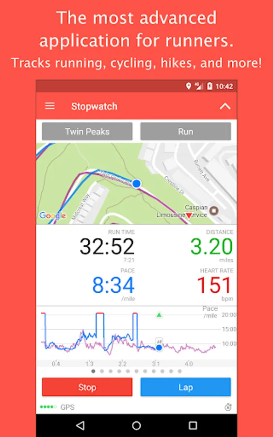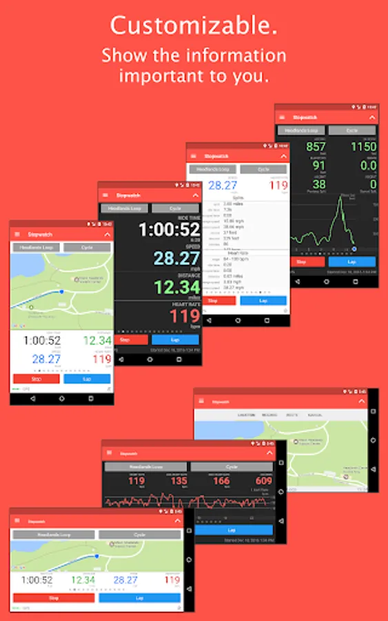 • Swipe across the stopwatch to see pages of stats, maps, and graphs - completely configurable.